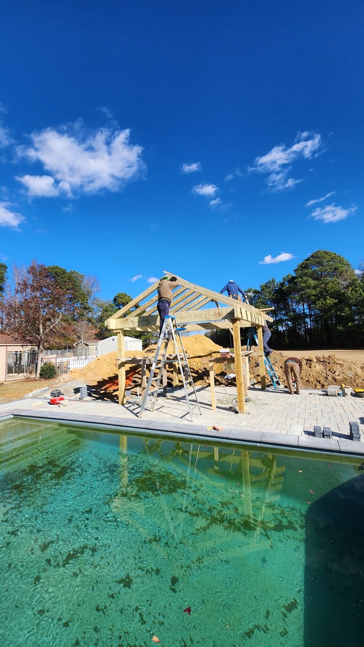 We build the patios, outdoor kitchens, fire features, and structures that complete your backyard. One contractor handles everything from your pool to the spaces around it.